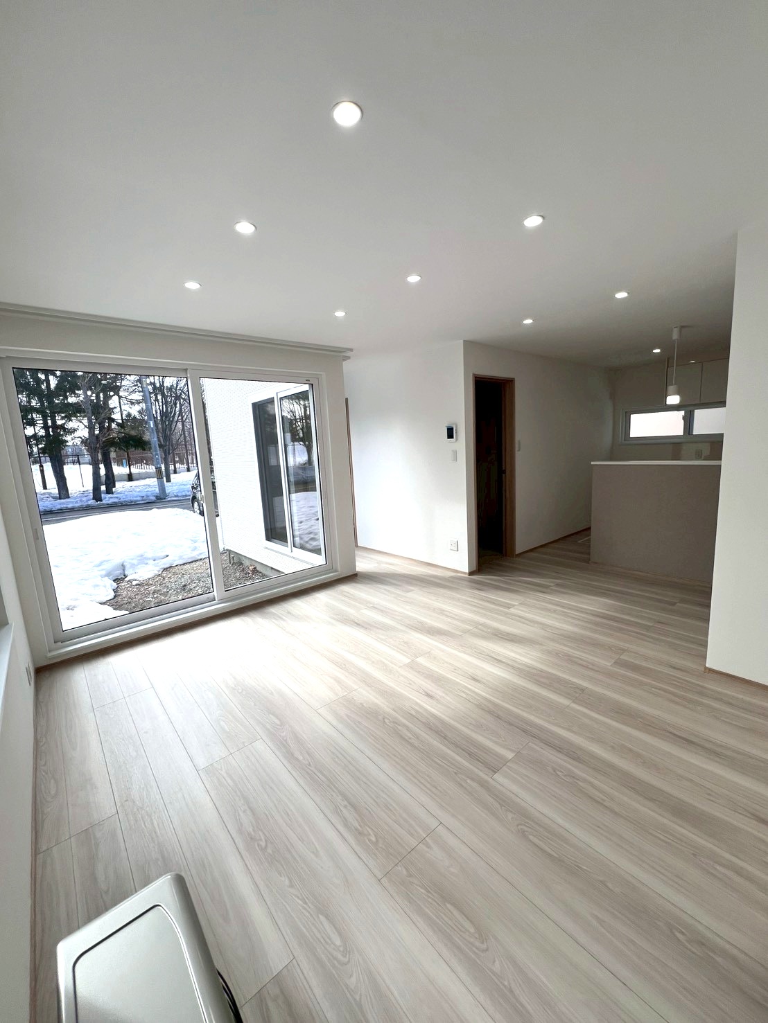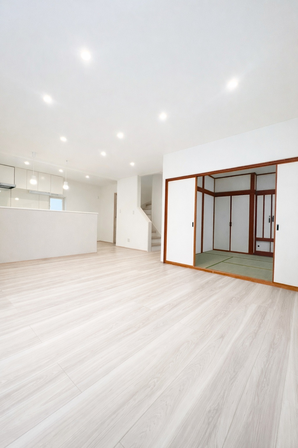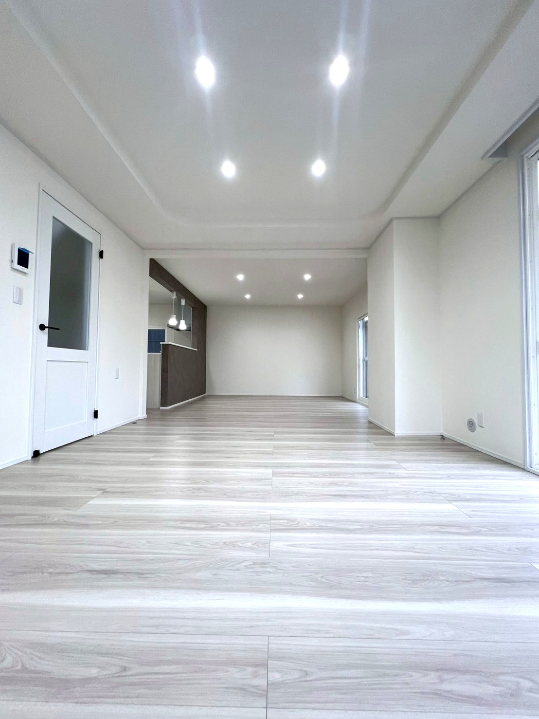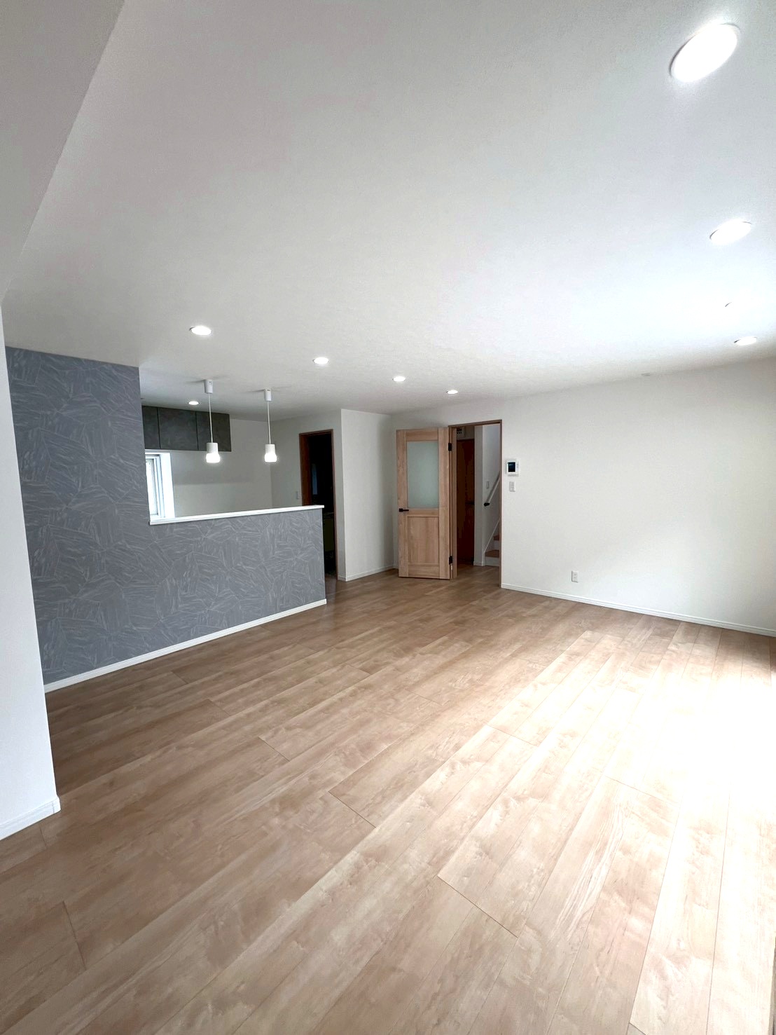 ペニンシュラキッチンを中心に据えたこの空間は、