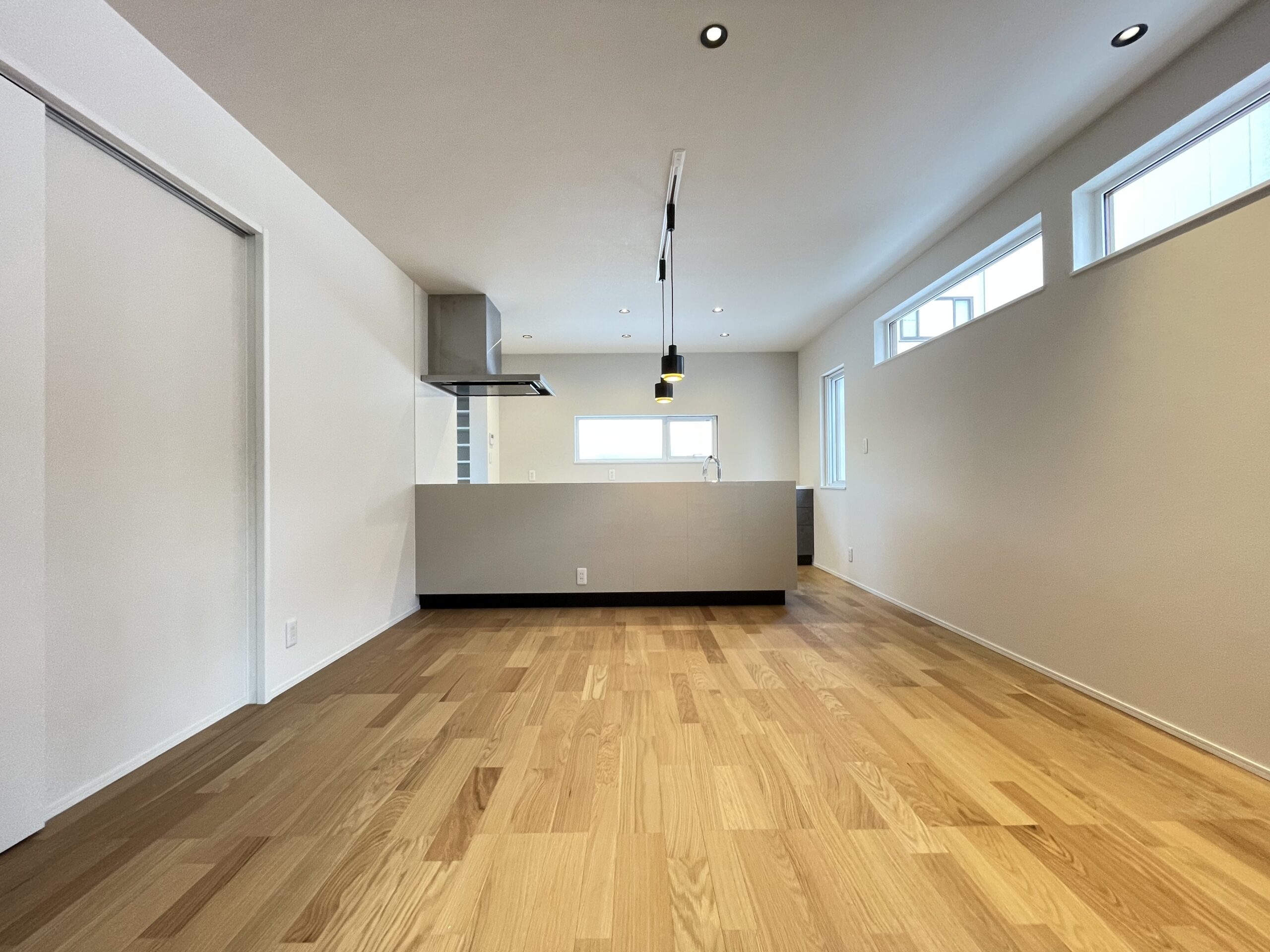 シンプルで高級感のあるスッキリとしたリビング。 窓は上に設置することで、人目が気にならない設計に。