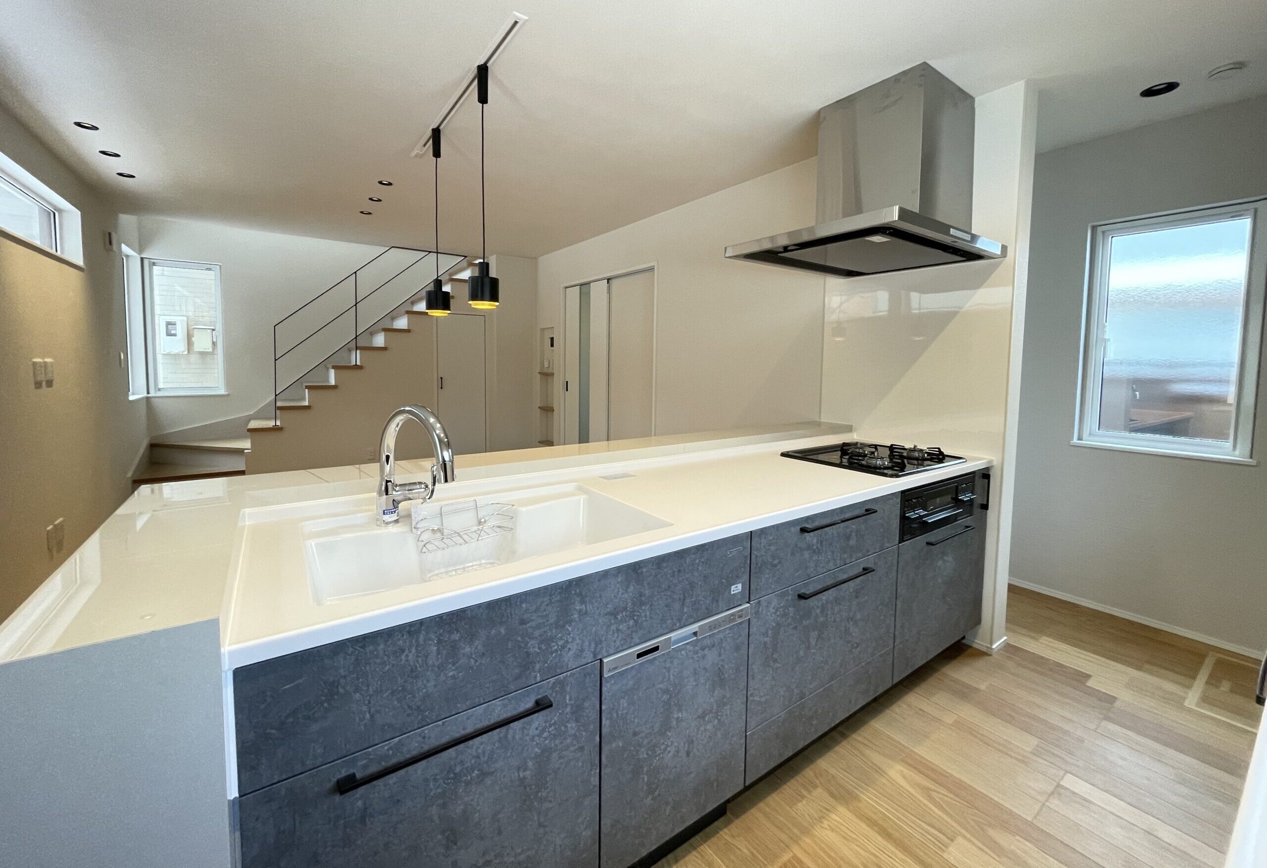 ペニンシュラキッチンを中心に据えたこの空間は、