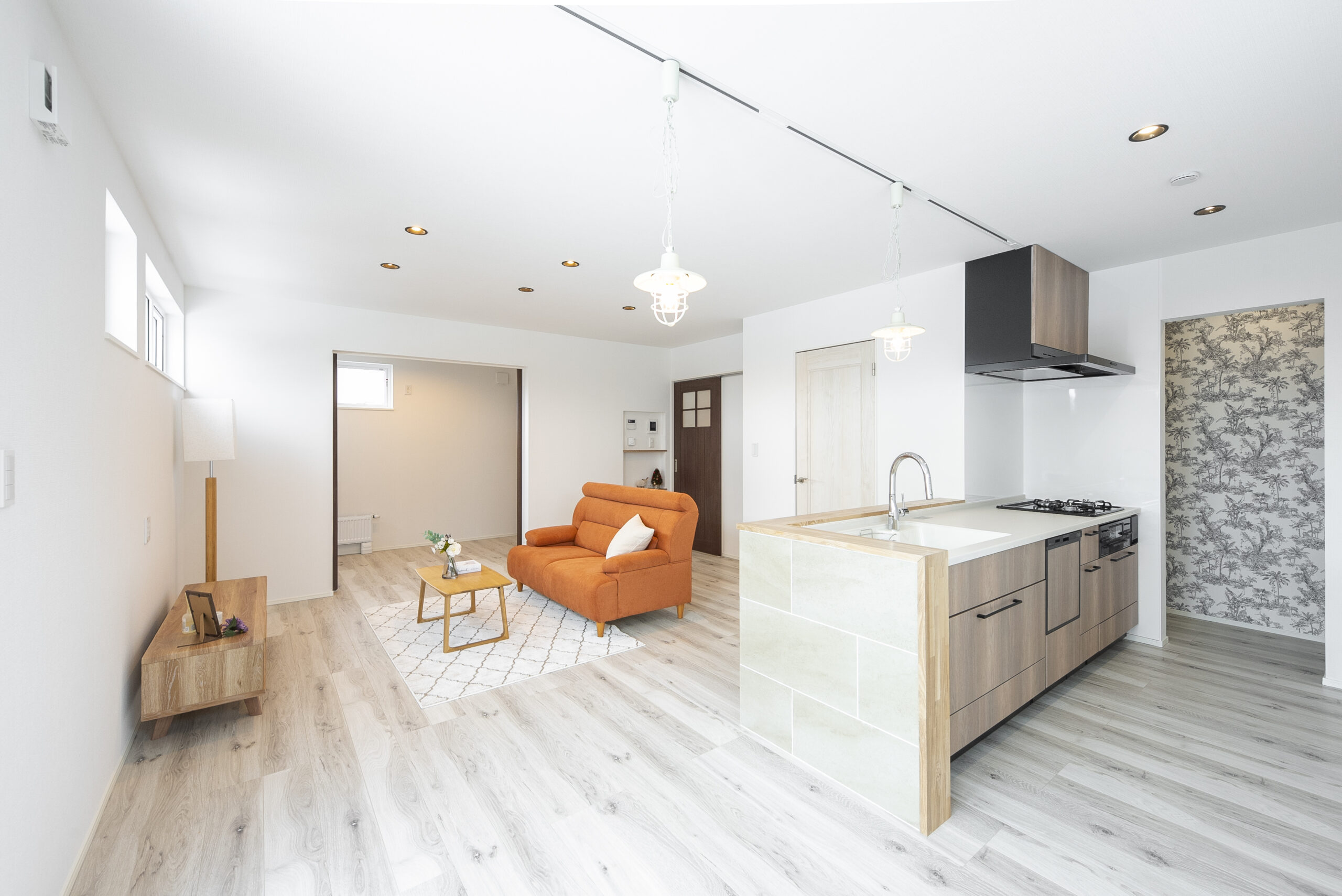 マリン調の照明を使用したナチュラルテイストのリビング。 キッチン横にはダイニングテーブルを設置します。