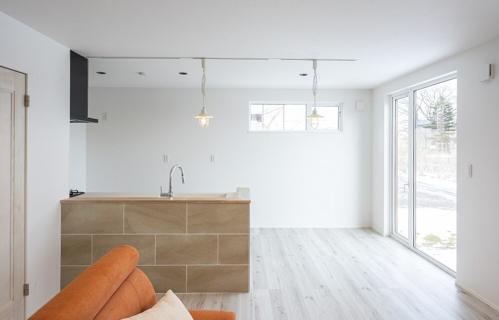 ペニンシュラキッチンを中心に据えたこの空間は、