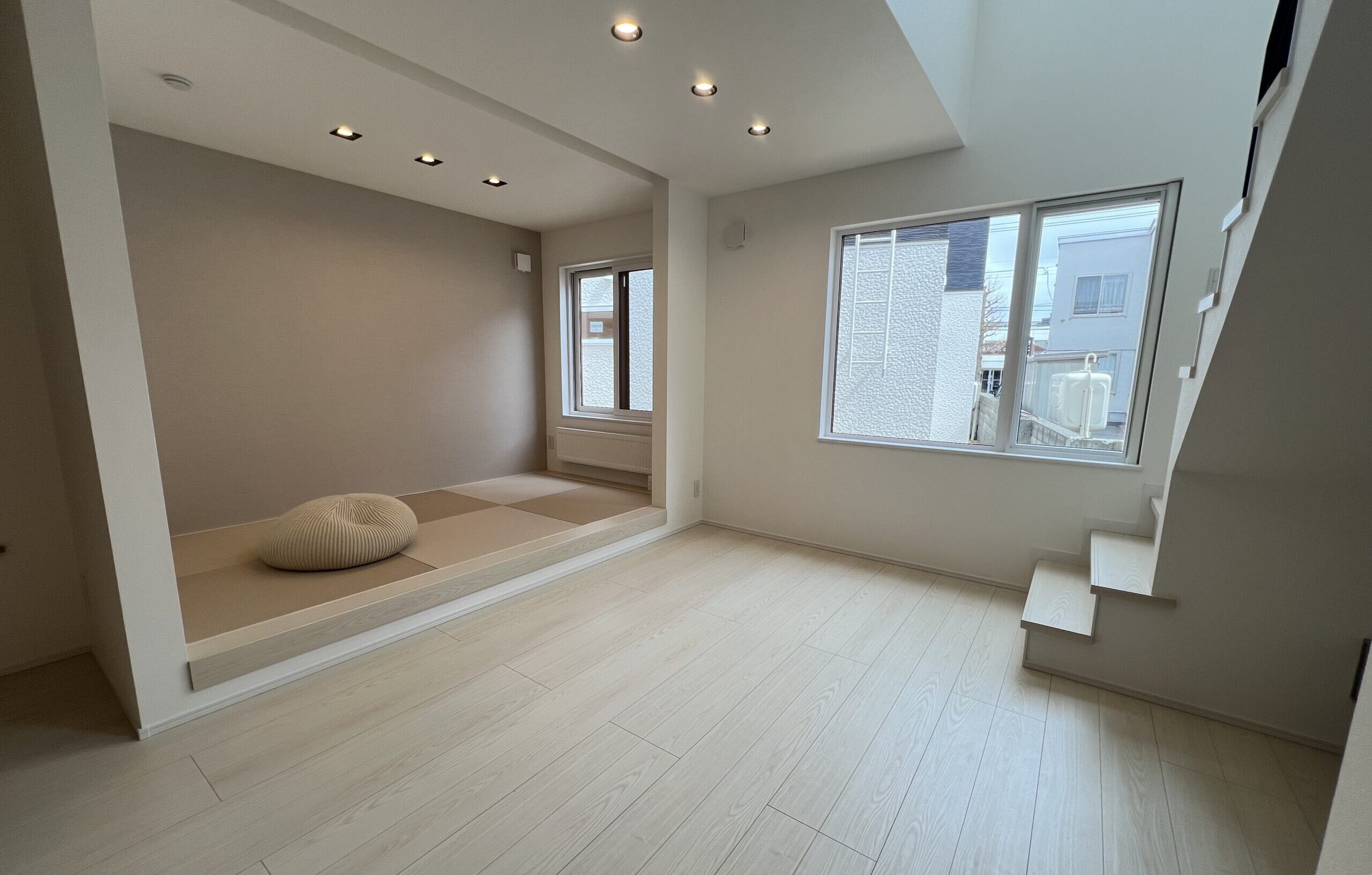 リビング横の小上がりスペースは、くつろぎながらTVを見られる設計に。ロールカーテンで区切ることもできます。