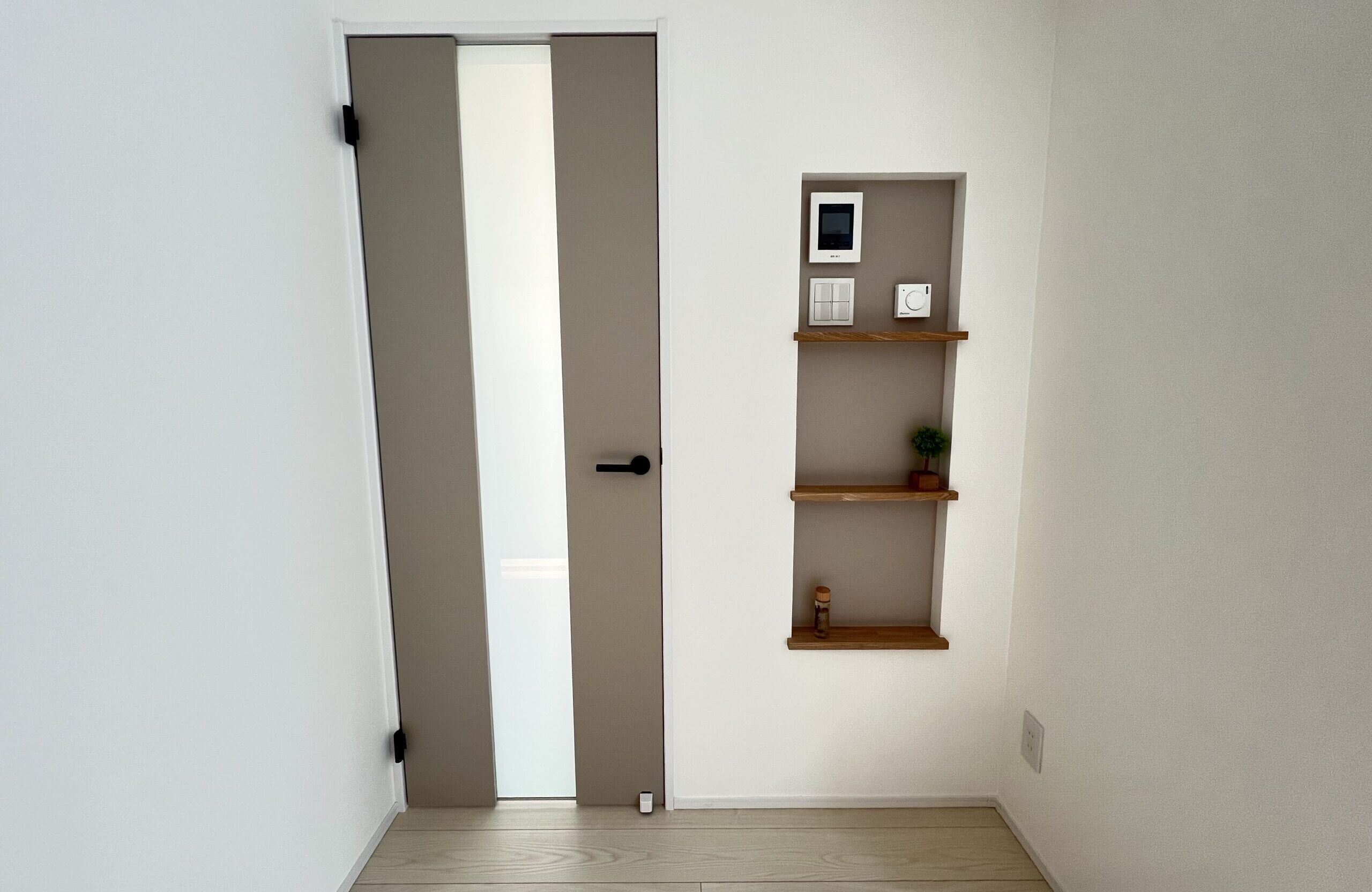 人気のくすみカラーの扉とスイッチニッチのクロスの色を合わせて統一感を出しています。