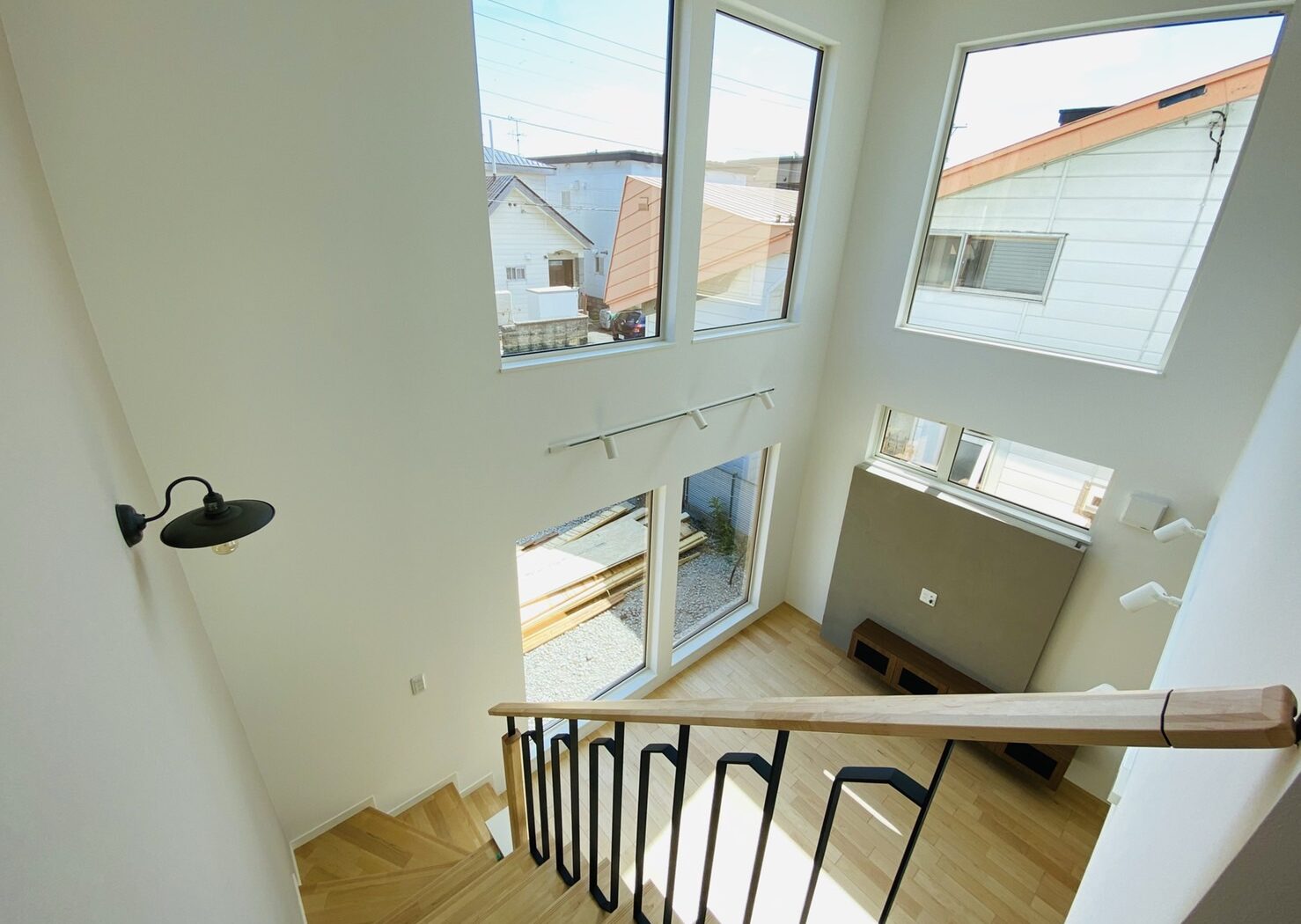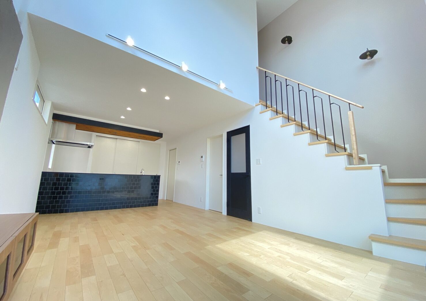 大きな吹き抜けにより、リビングが開放感のある空間に。 昼は自然光をたくさん取り込み、温かい落ち着いた色合いになります。