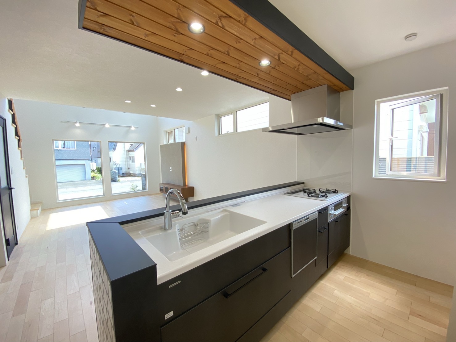 羽目板を使用した下がり天井がおしゃれなキッチン 黒のキッチンが高級感UP!