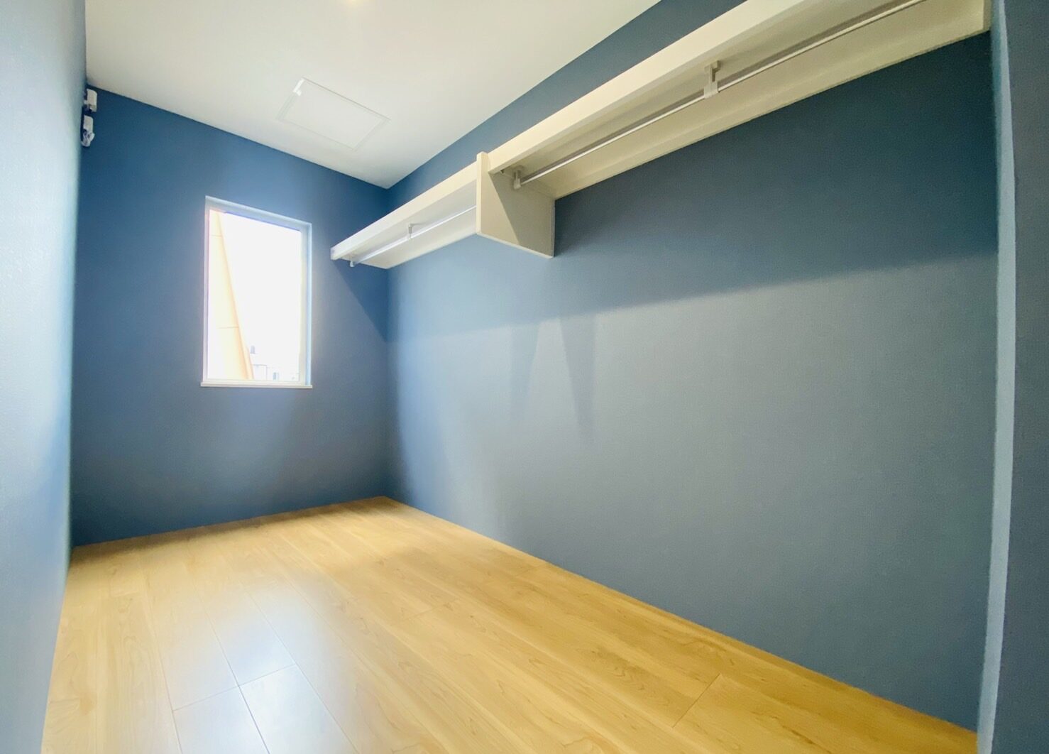 大容量のウォークインクローゼットには落ち着いた淡いブルーを使用。 かわいらしさと爽やかさを兼ね備えた広々とした収納空間です。