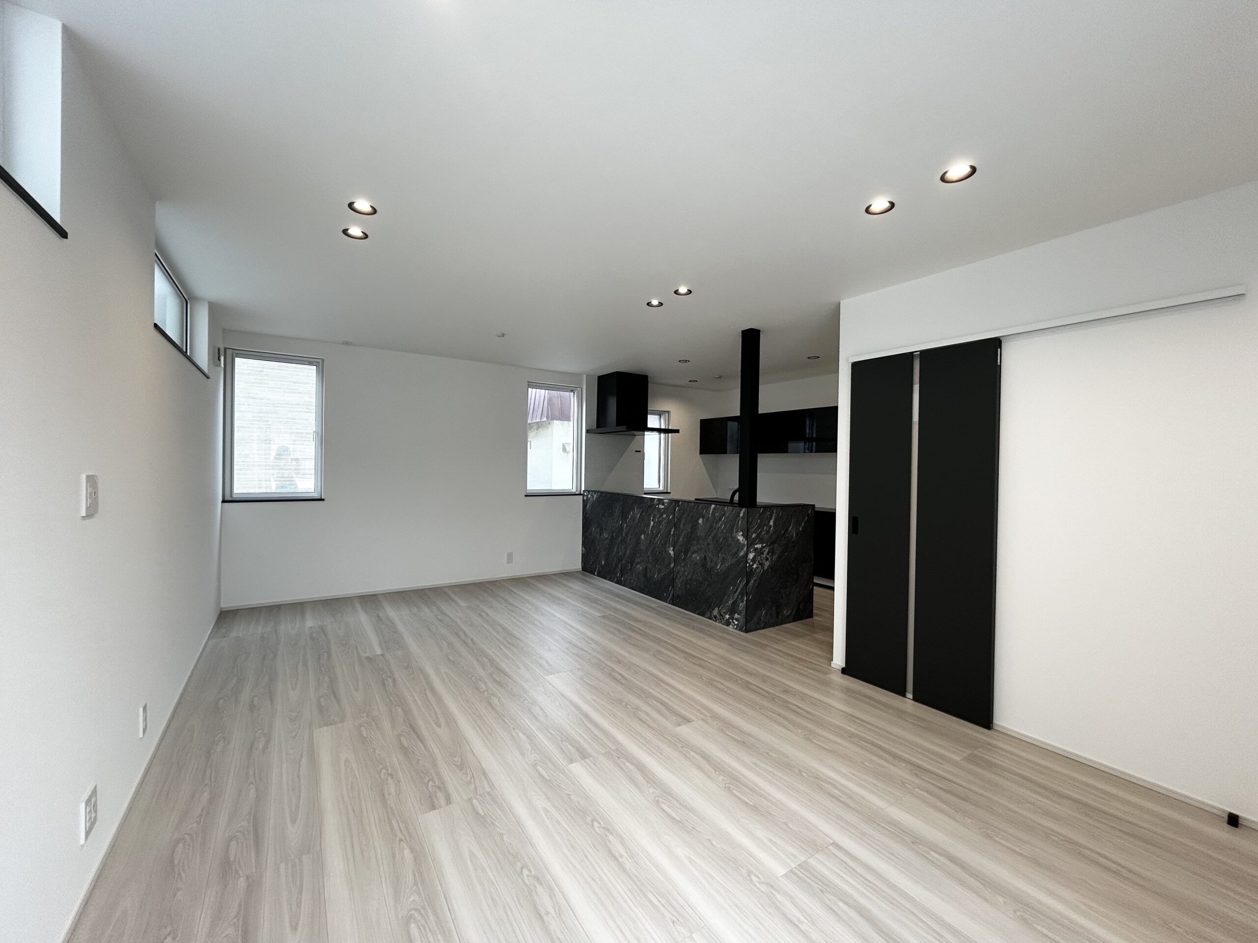 ペニンシュラキッチンを中心に据えたこの空間は、