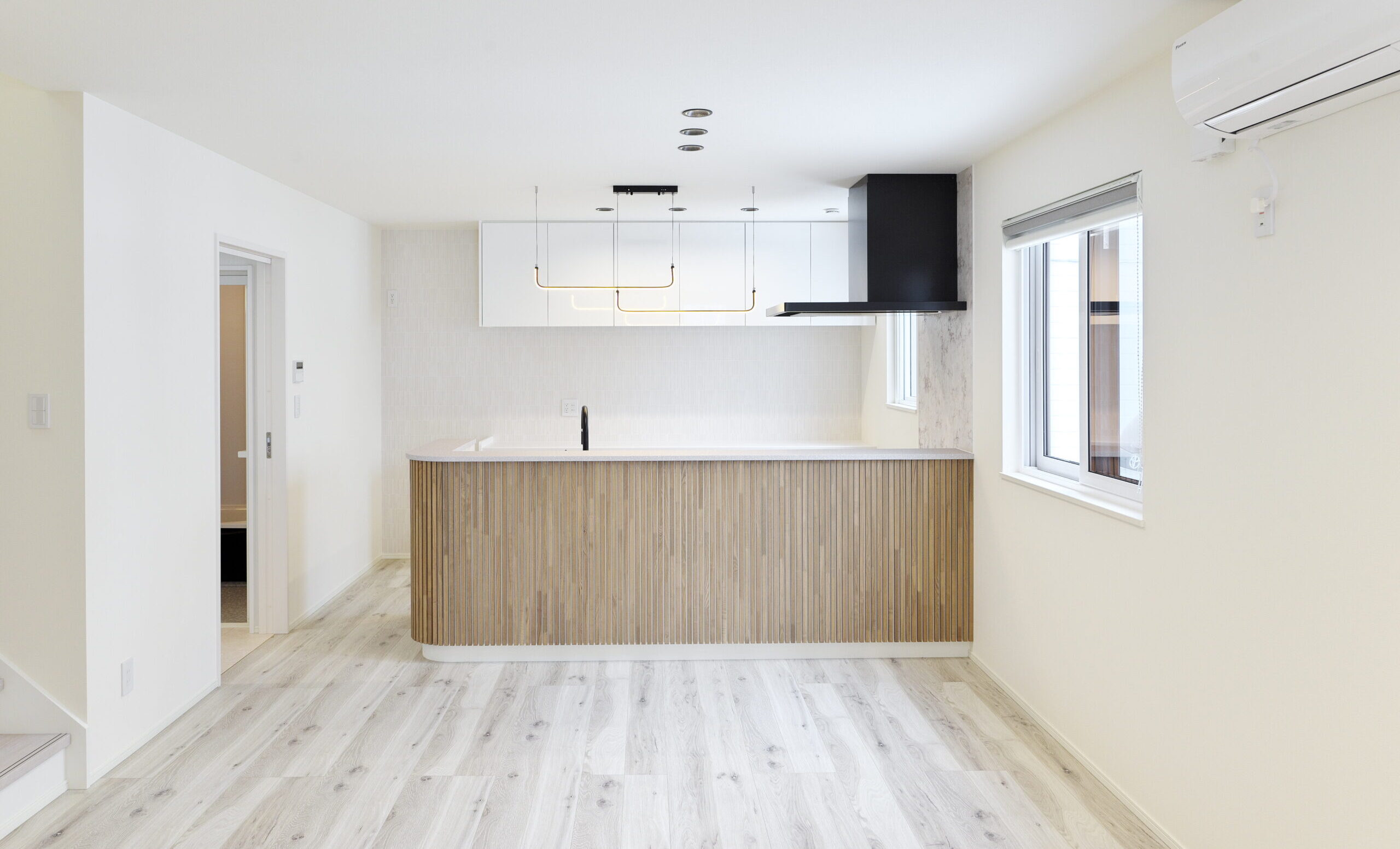 リビングで過ごす時も目に入ってくるキッチンには木目を使用し、スタイリッシュな照明を合わせて雰囲気作り。