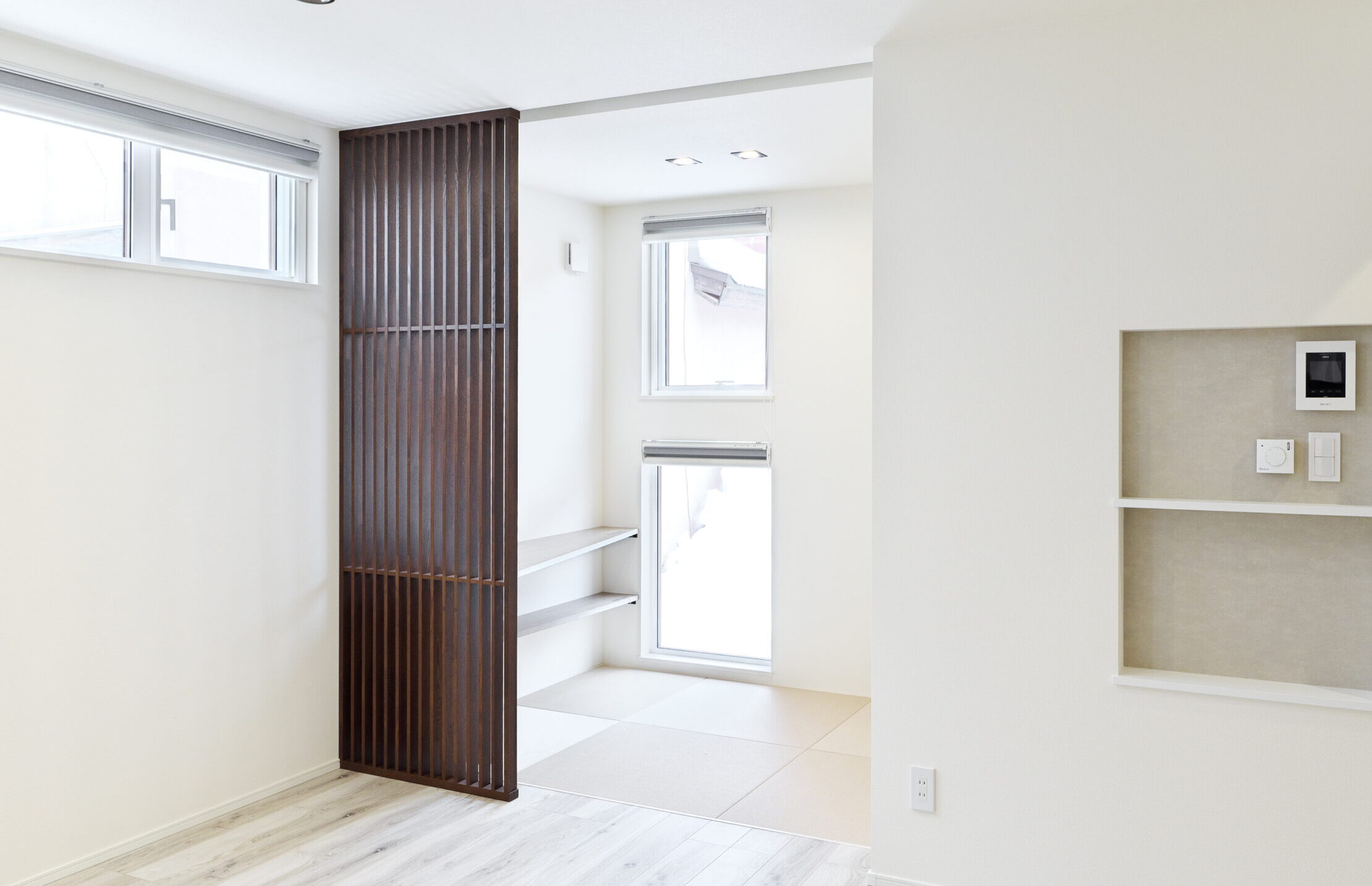 リビング続きの和室は、モダンテイストにすることでオシャレで落ち着く空間に。