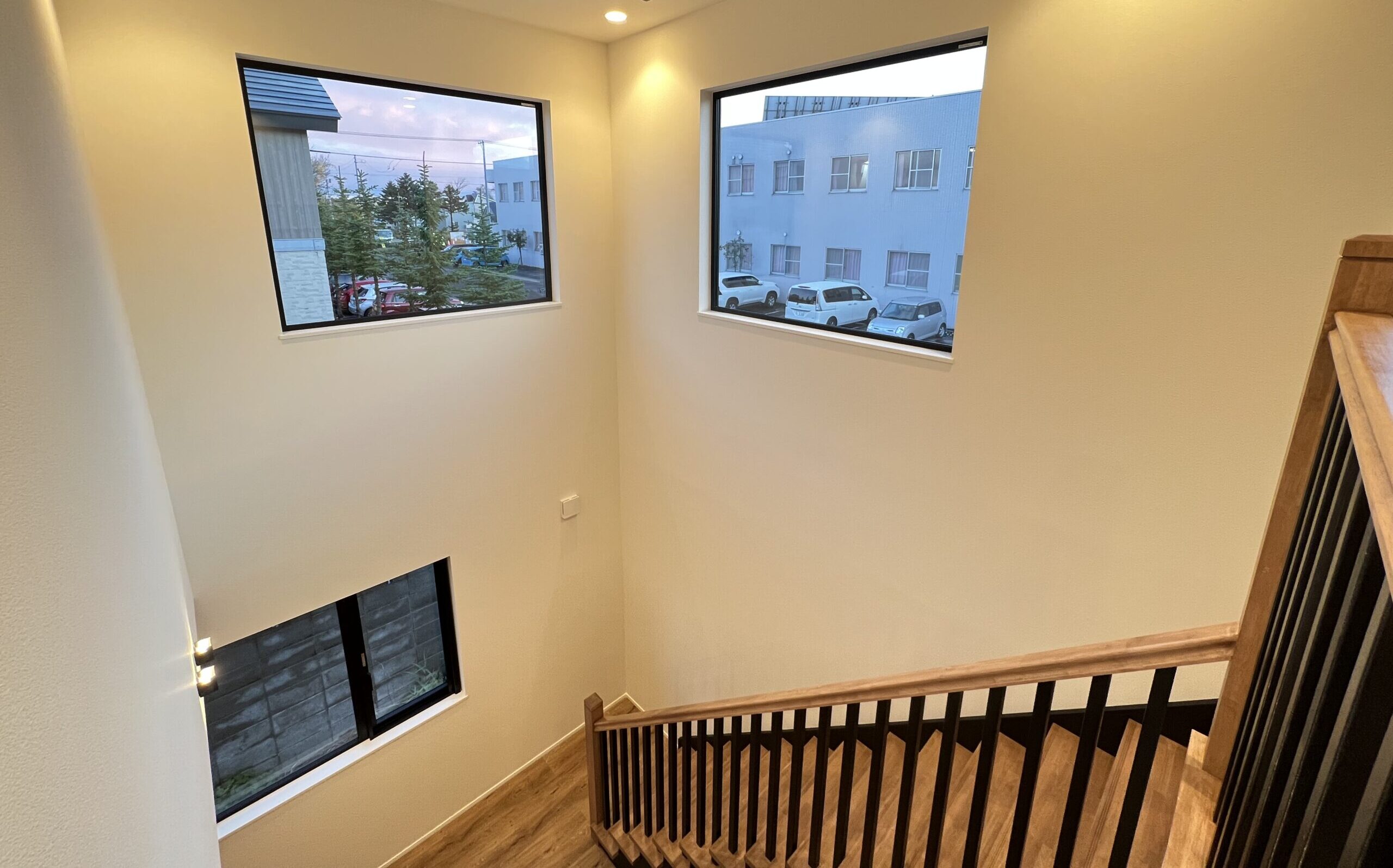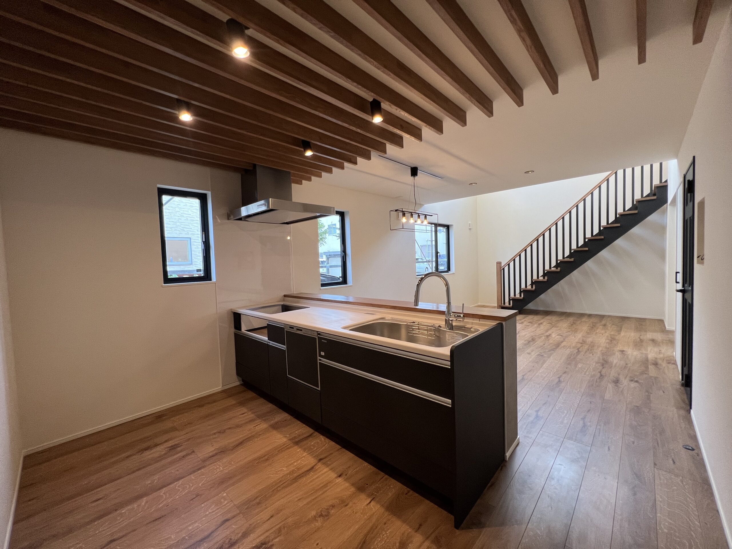 階段手すりから続くアイアン風塗装のルーバーは、空間に抜け感を作ります。