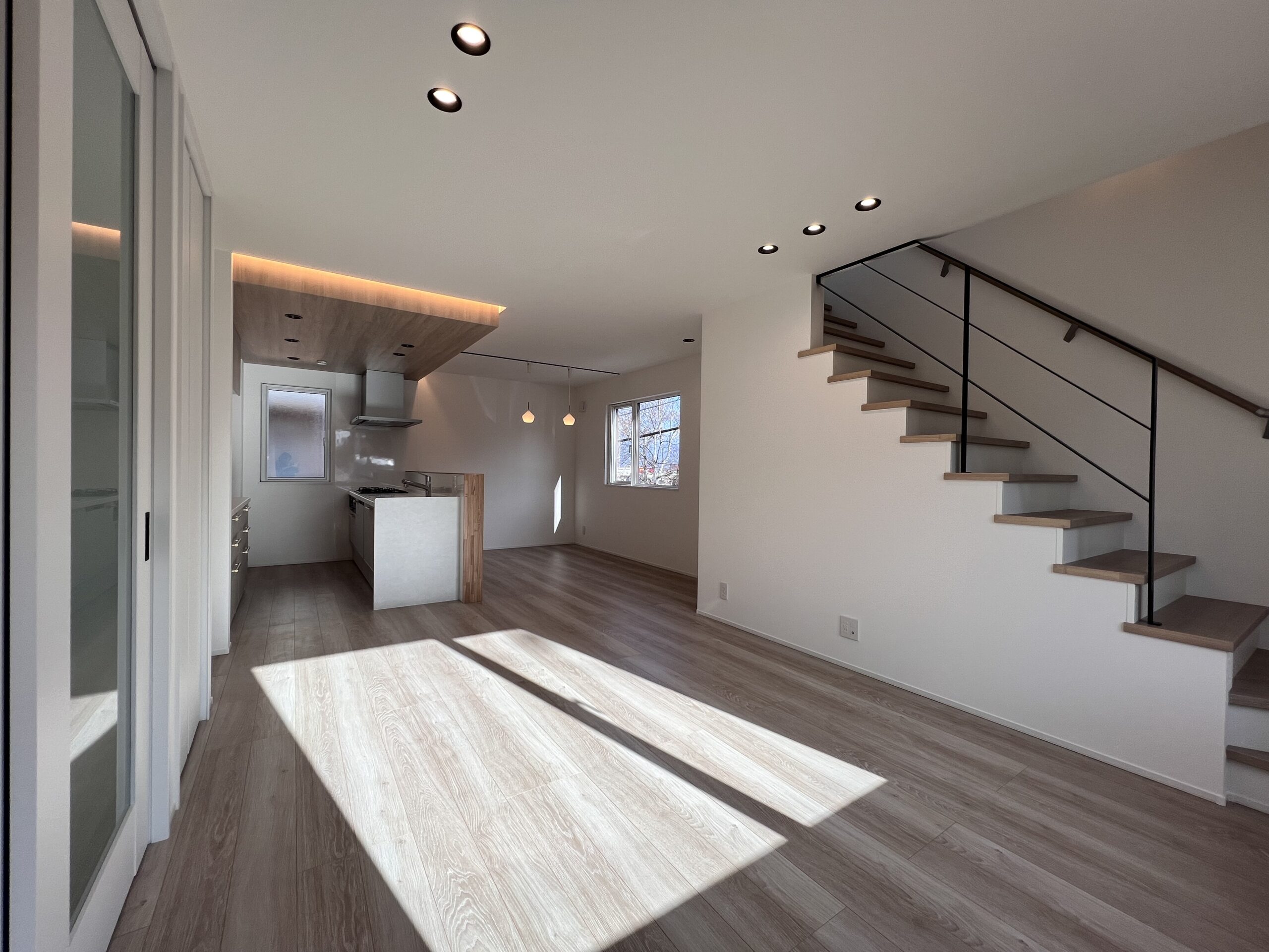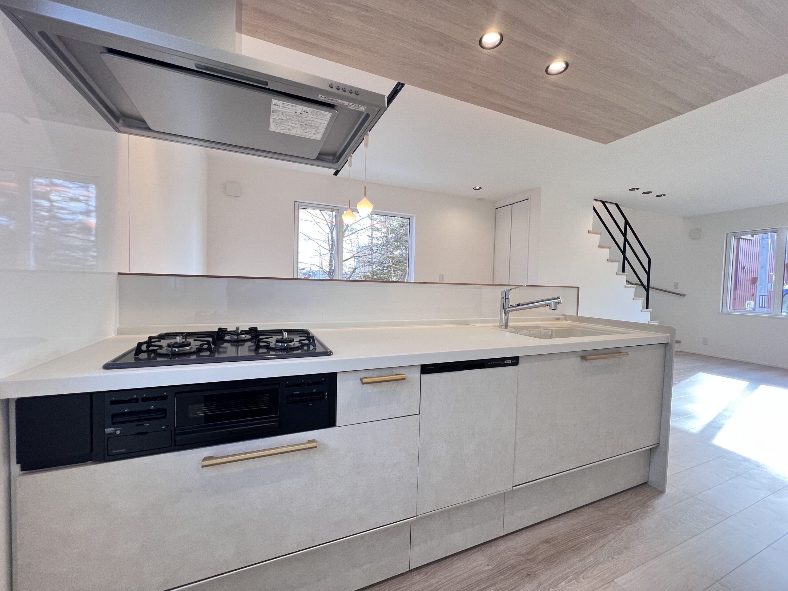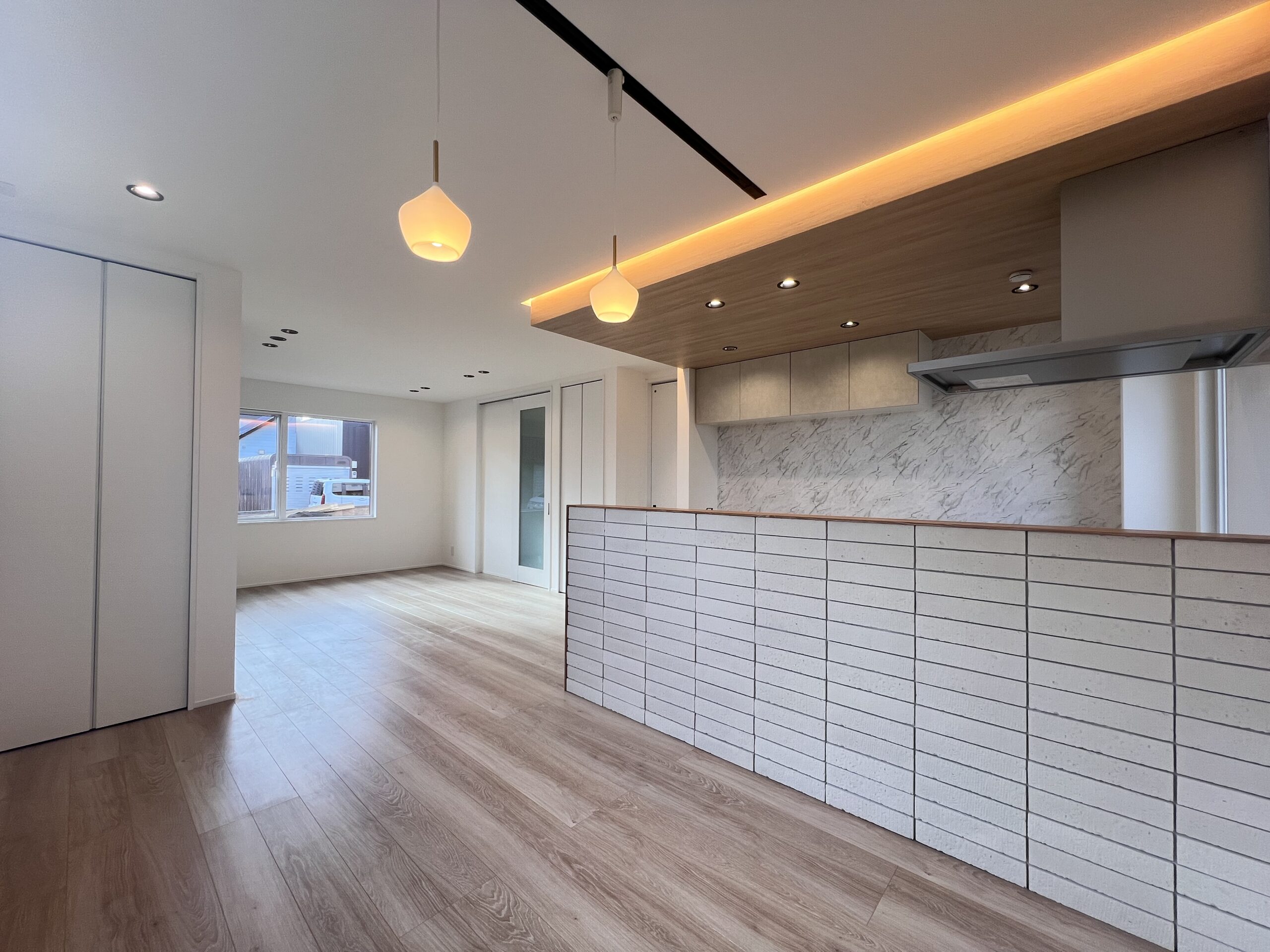 ペニンシュラキッチンを中心に据えたこの空間は、
