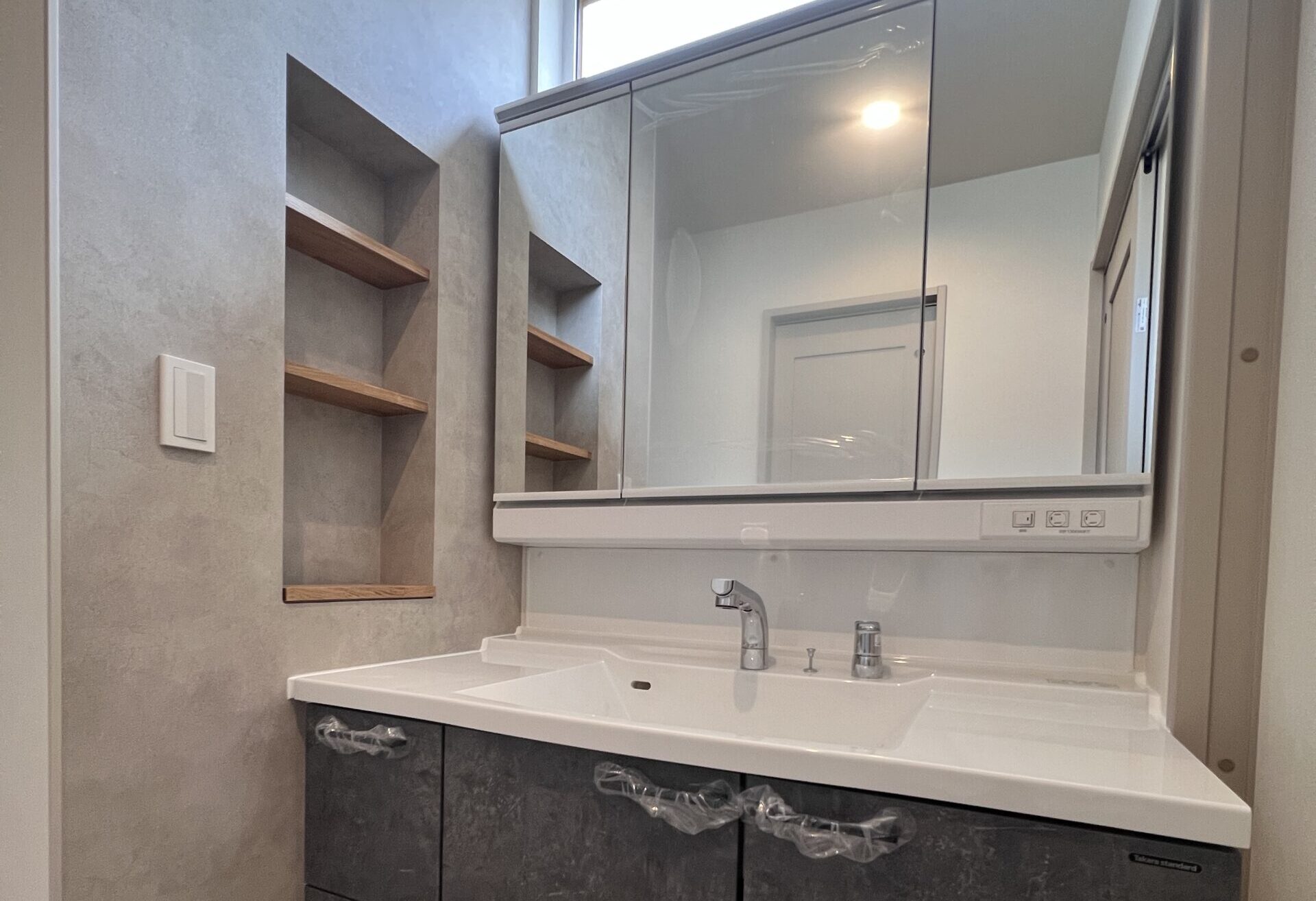 洗面所左のニッチにはドライヤー用の隠しコンセントがあり、コードをすっきりと収納することができます。