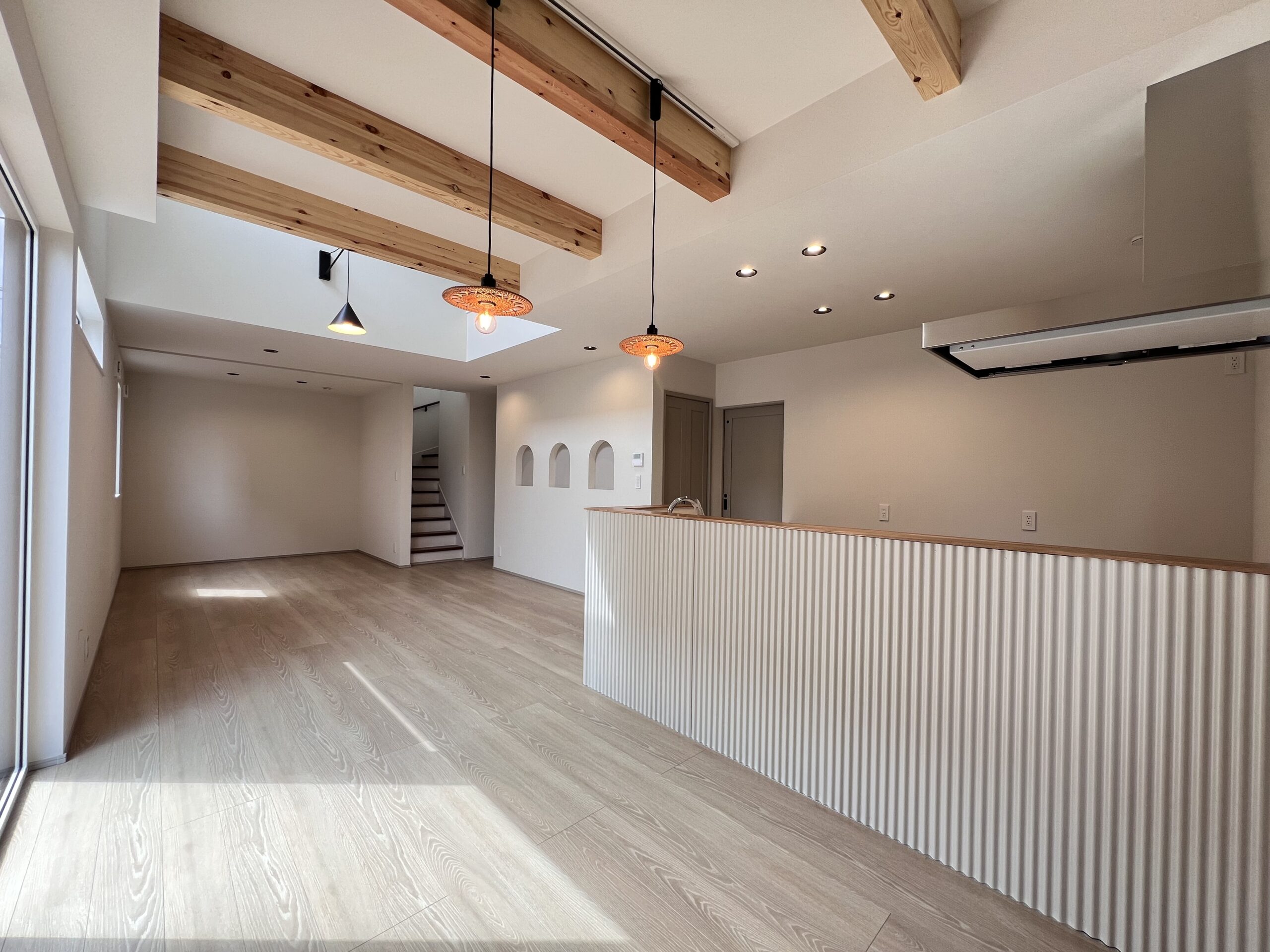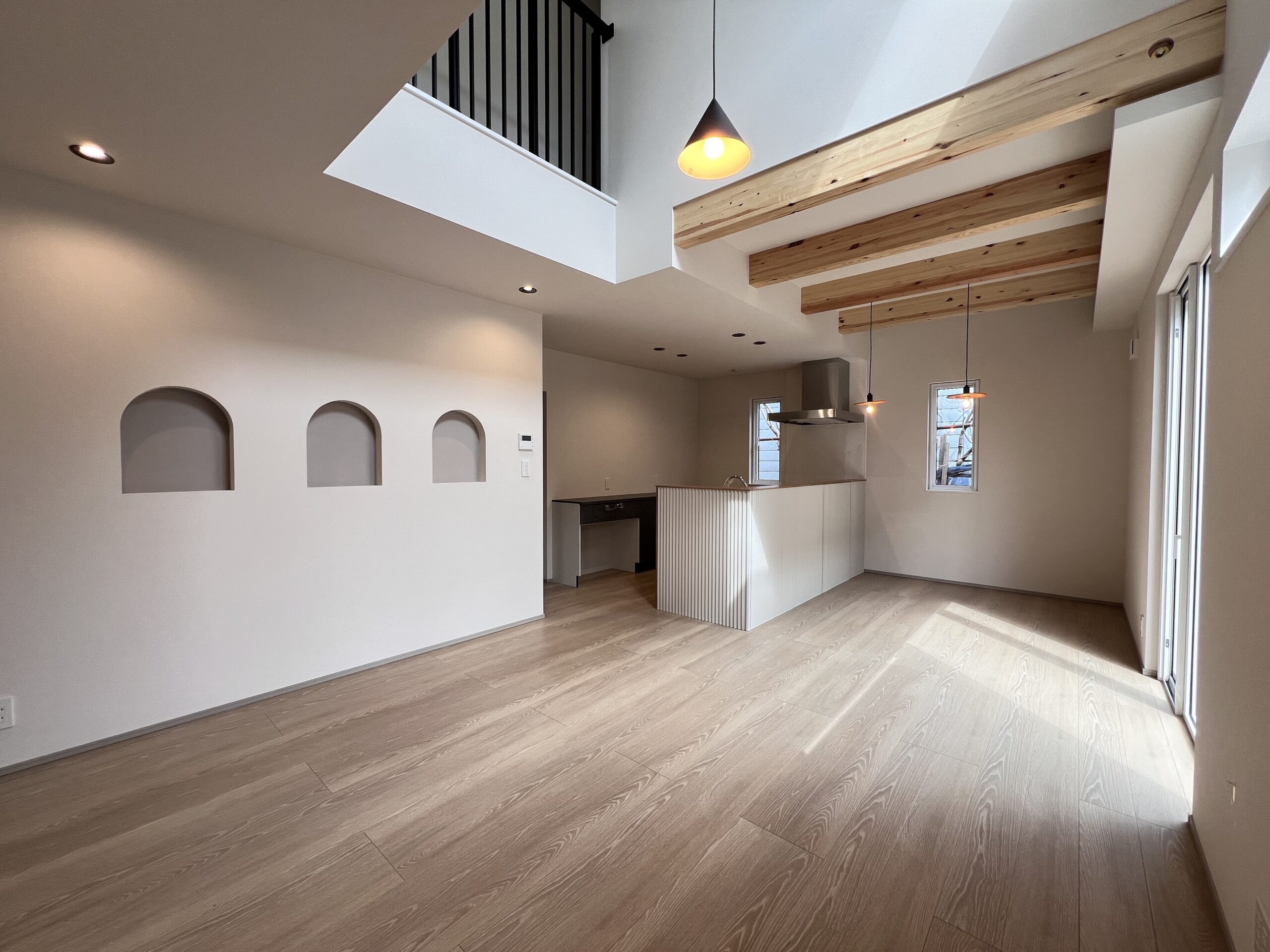 吹き抜けからも光が差し込むリビング。 おしゃれなペンダントライトと魅せ梁で温かい空間が広がります。 Rがかわいいニッチもリビングのアクセントに!