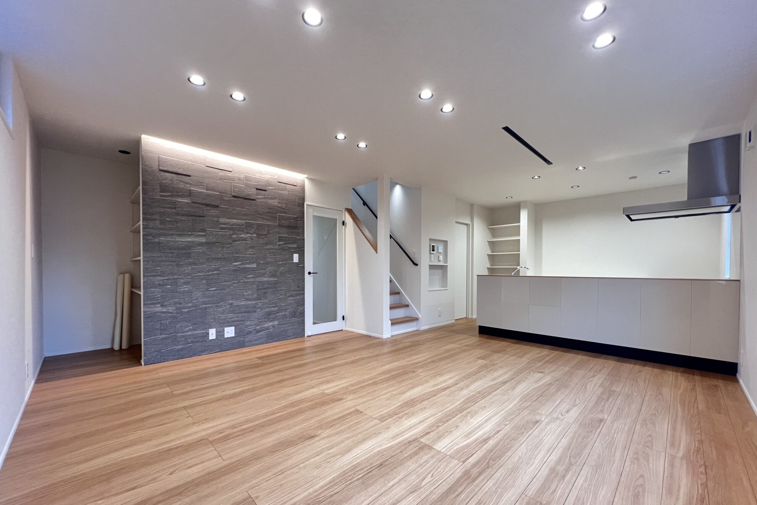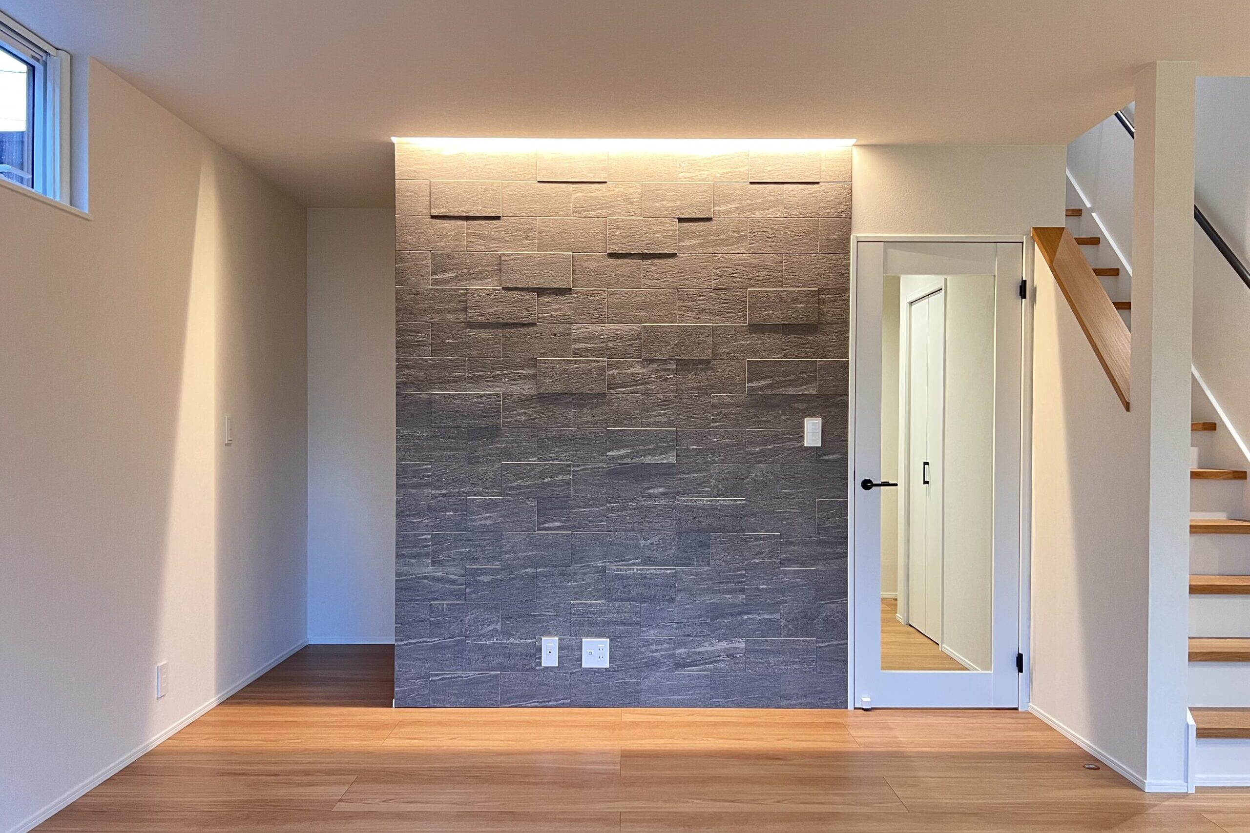 石調のアクセントウォール(エコカラット)と間接照明が、上質で落ち着いた雰囲気を演出。 シンプルながらも存在感のあるデザインです。