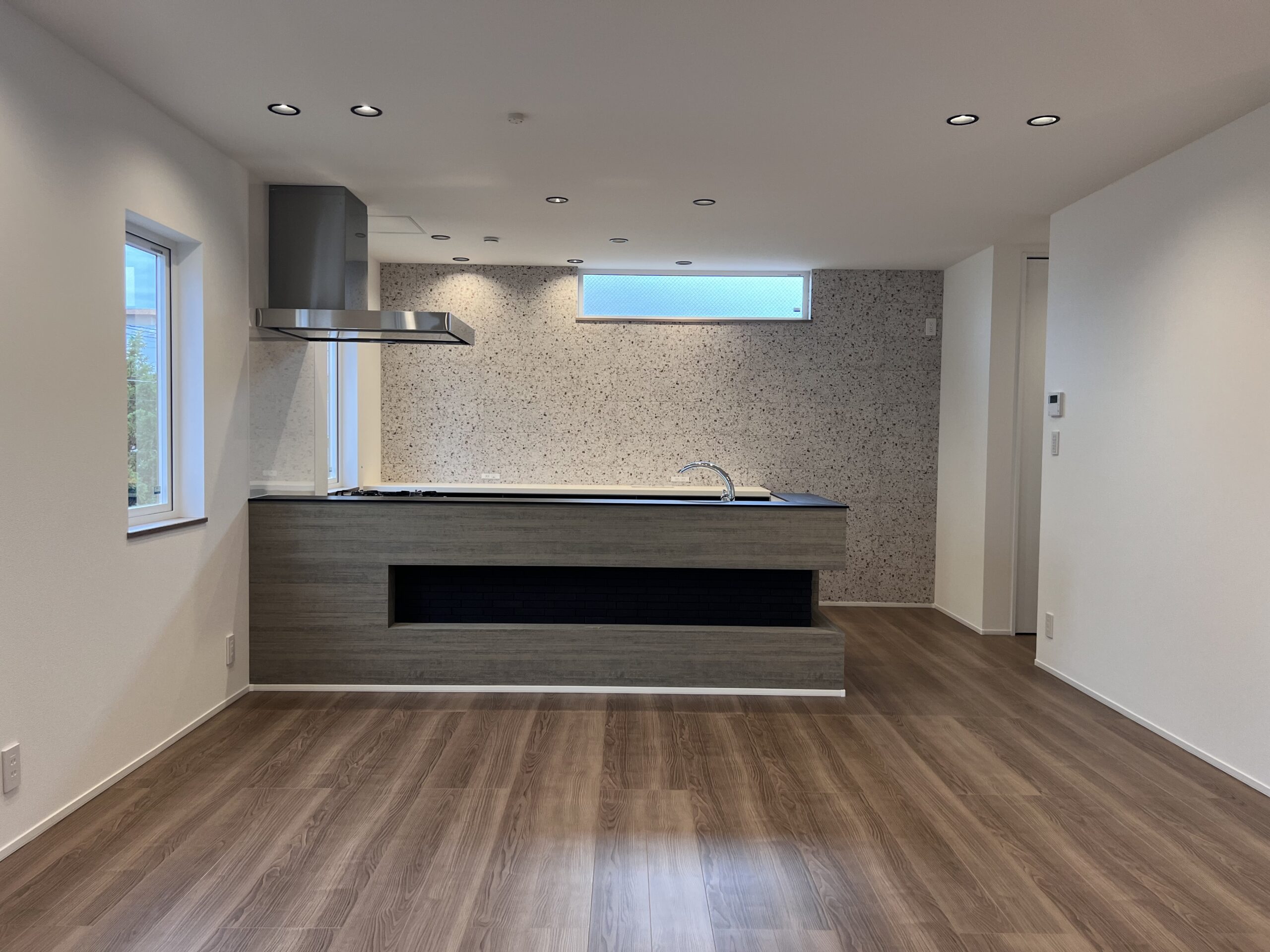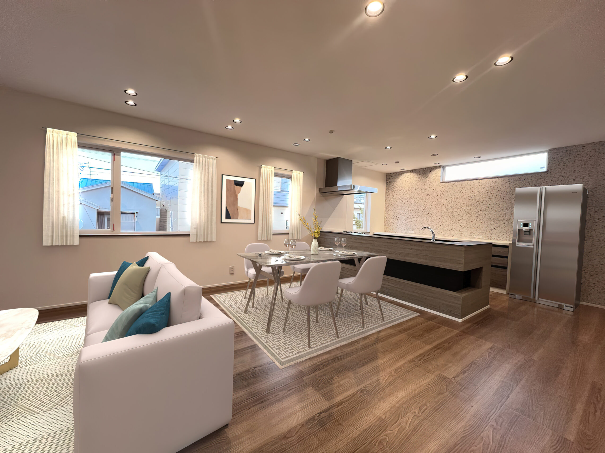 ペニンシュラキッチンを中心に据えたこの空間は、