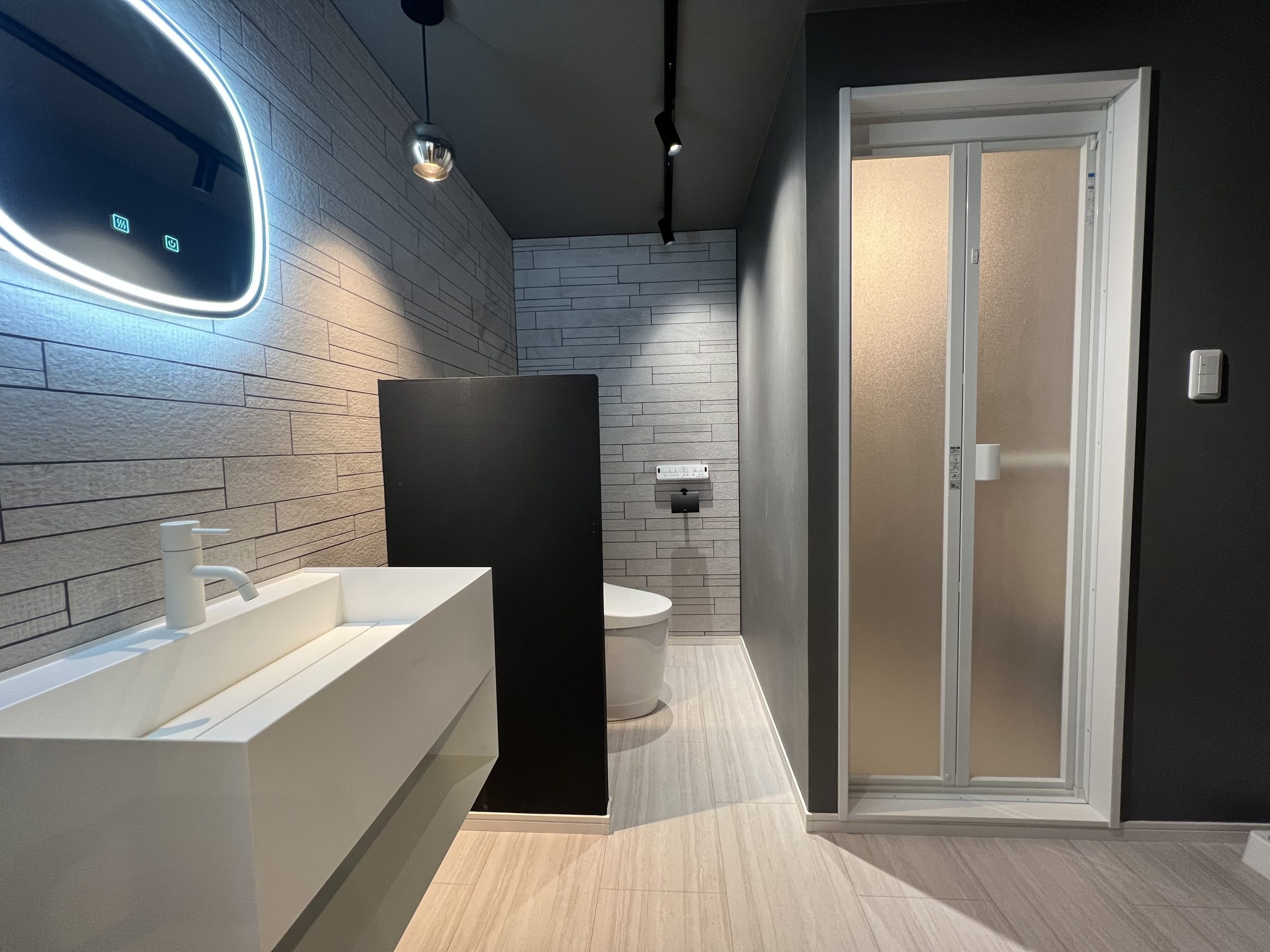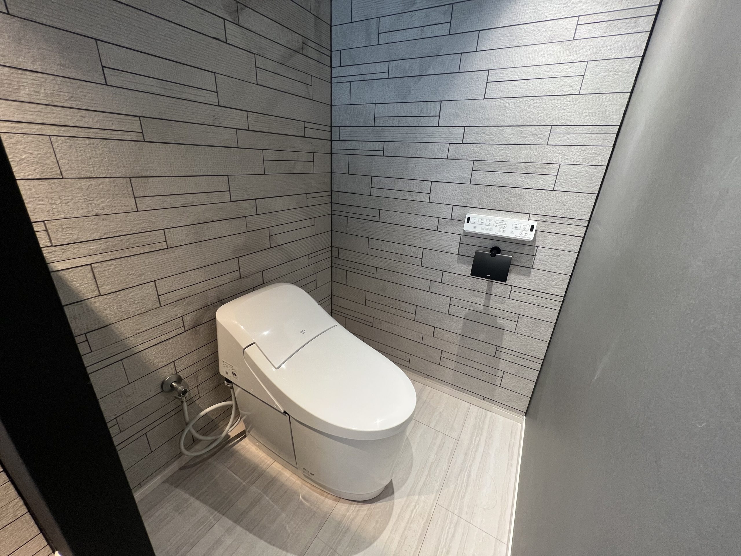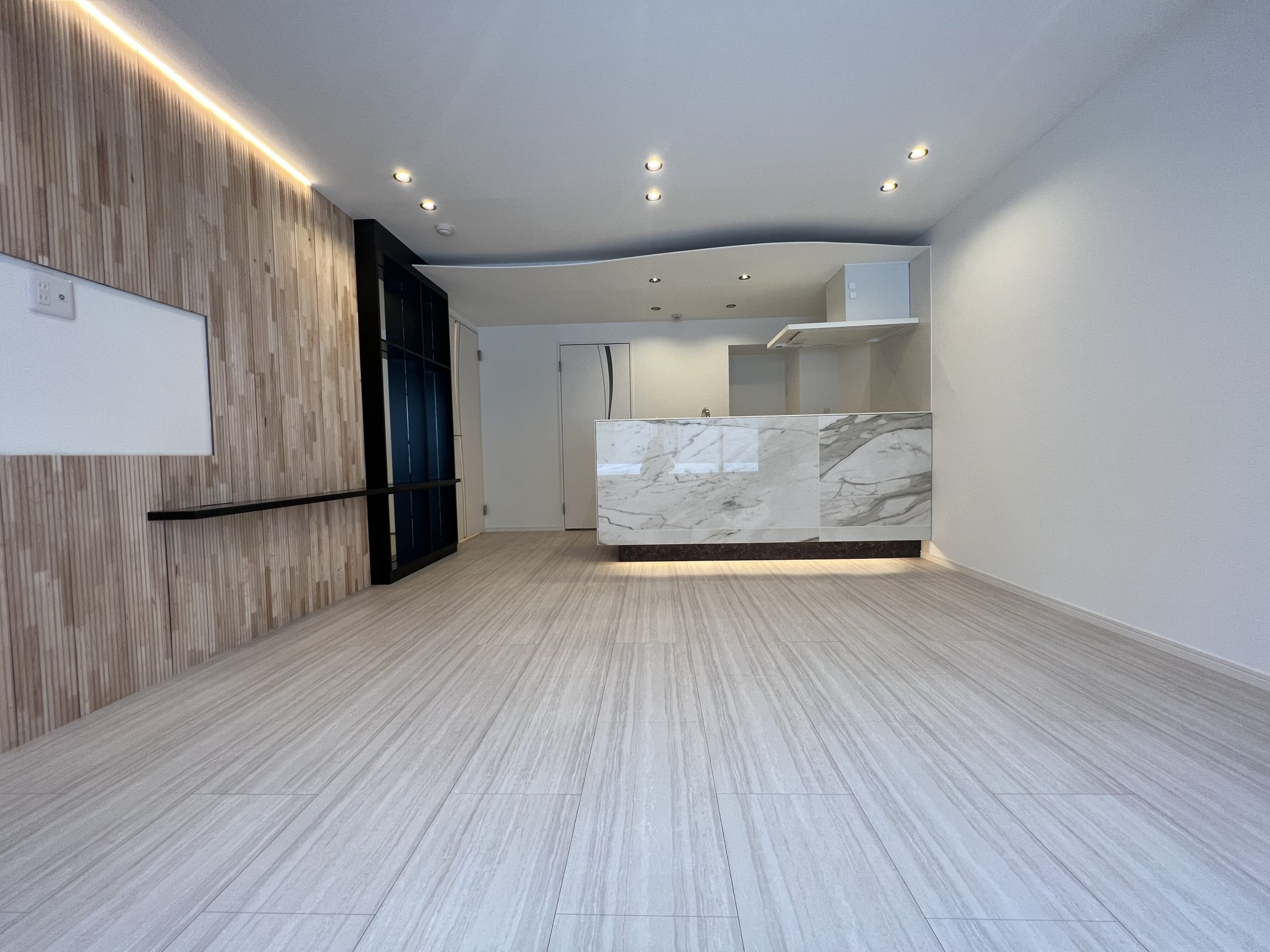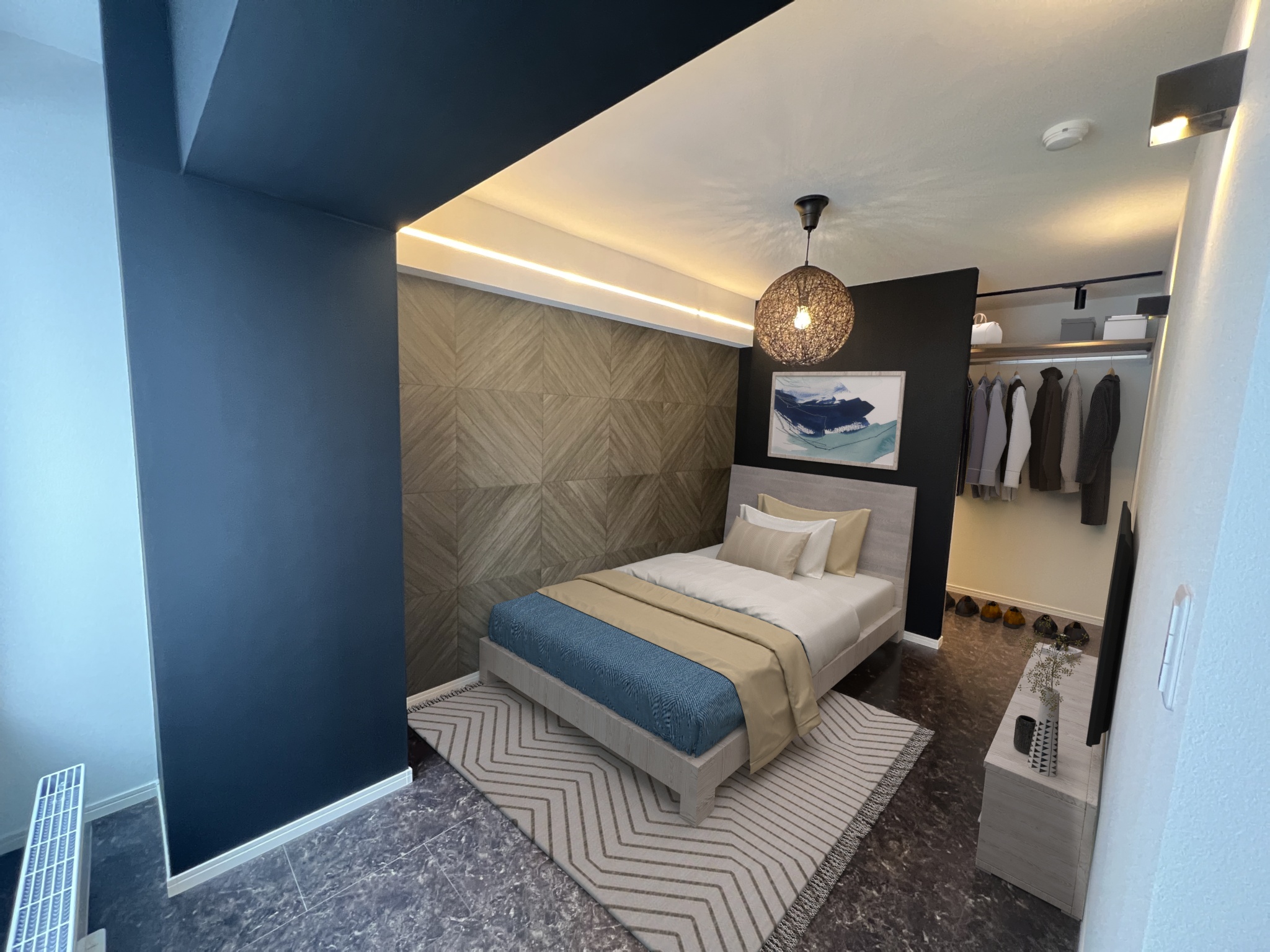 羽目板のアクセントや、大理石柄のキッチンタイル、おしゃれな水廻り、シックな寝室など1LDKの空間の中にぎゅーっとアクセントが詰まった空間です。