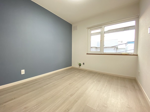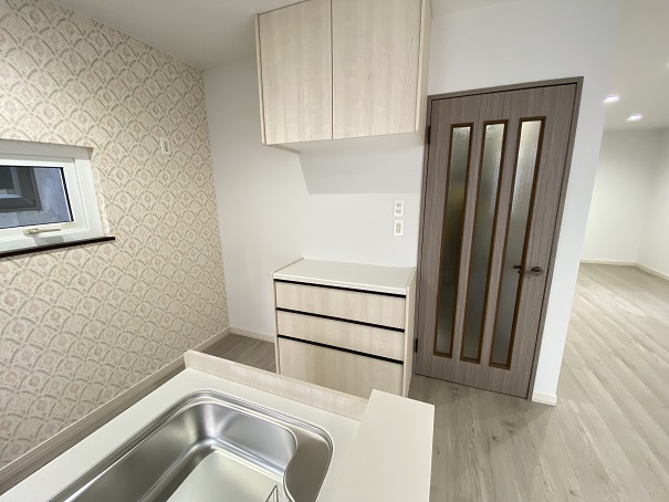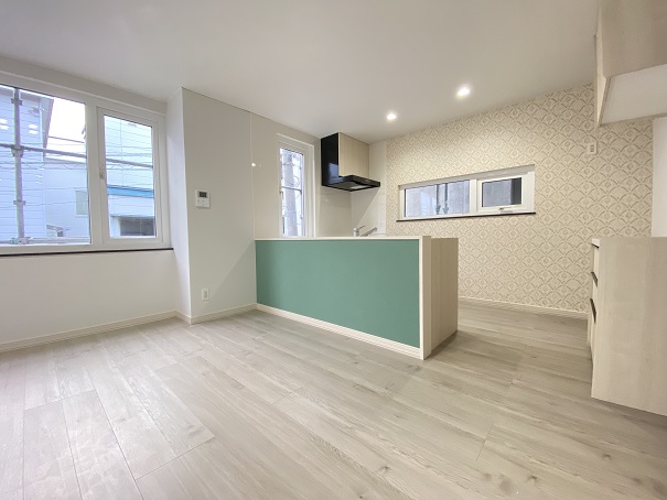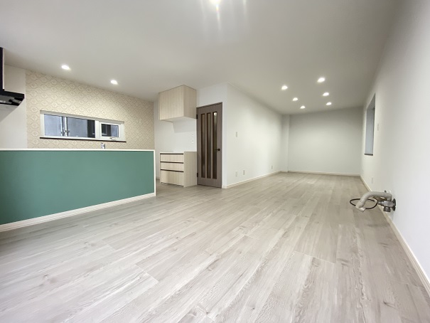 フローリングは白を基調としており、キッチンのアクセントクロスがとてもお洒落なお家です。