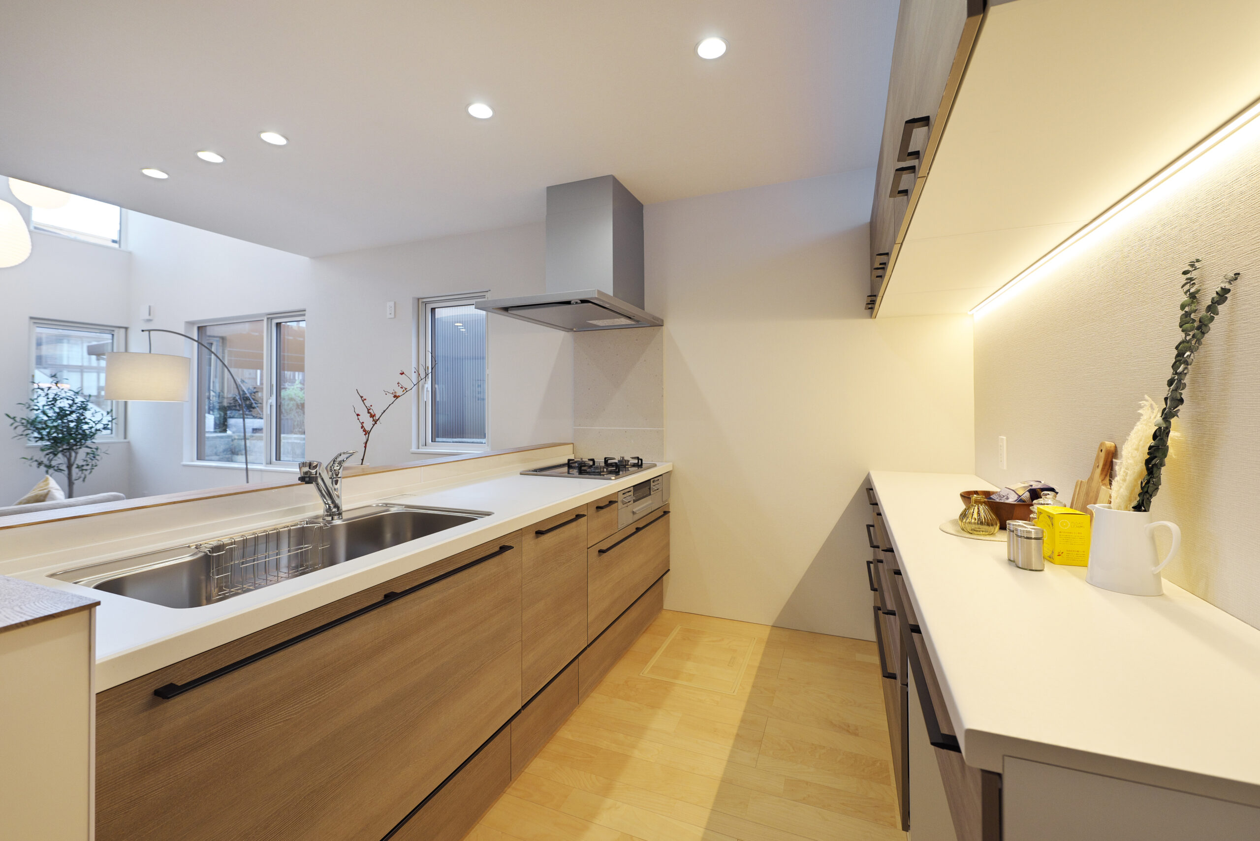 ペニンシュラキッチンを中心に据えたこの空間は、