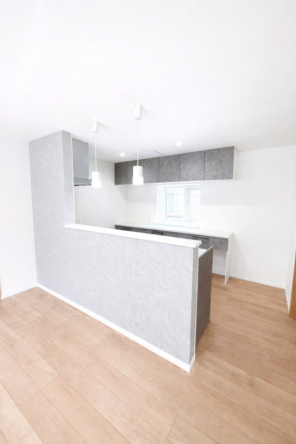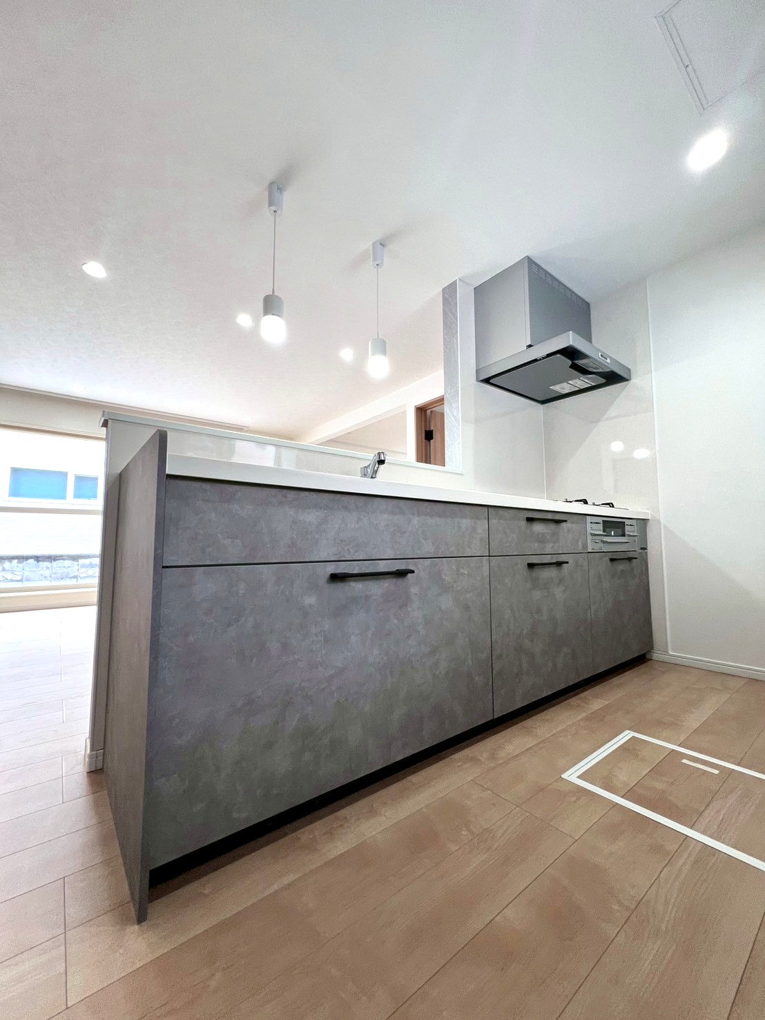 ペニンシュラキッチンを中心に据えたこの空間は、